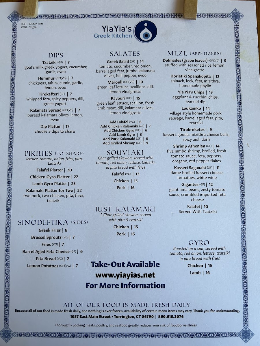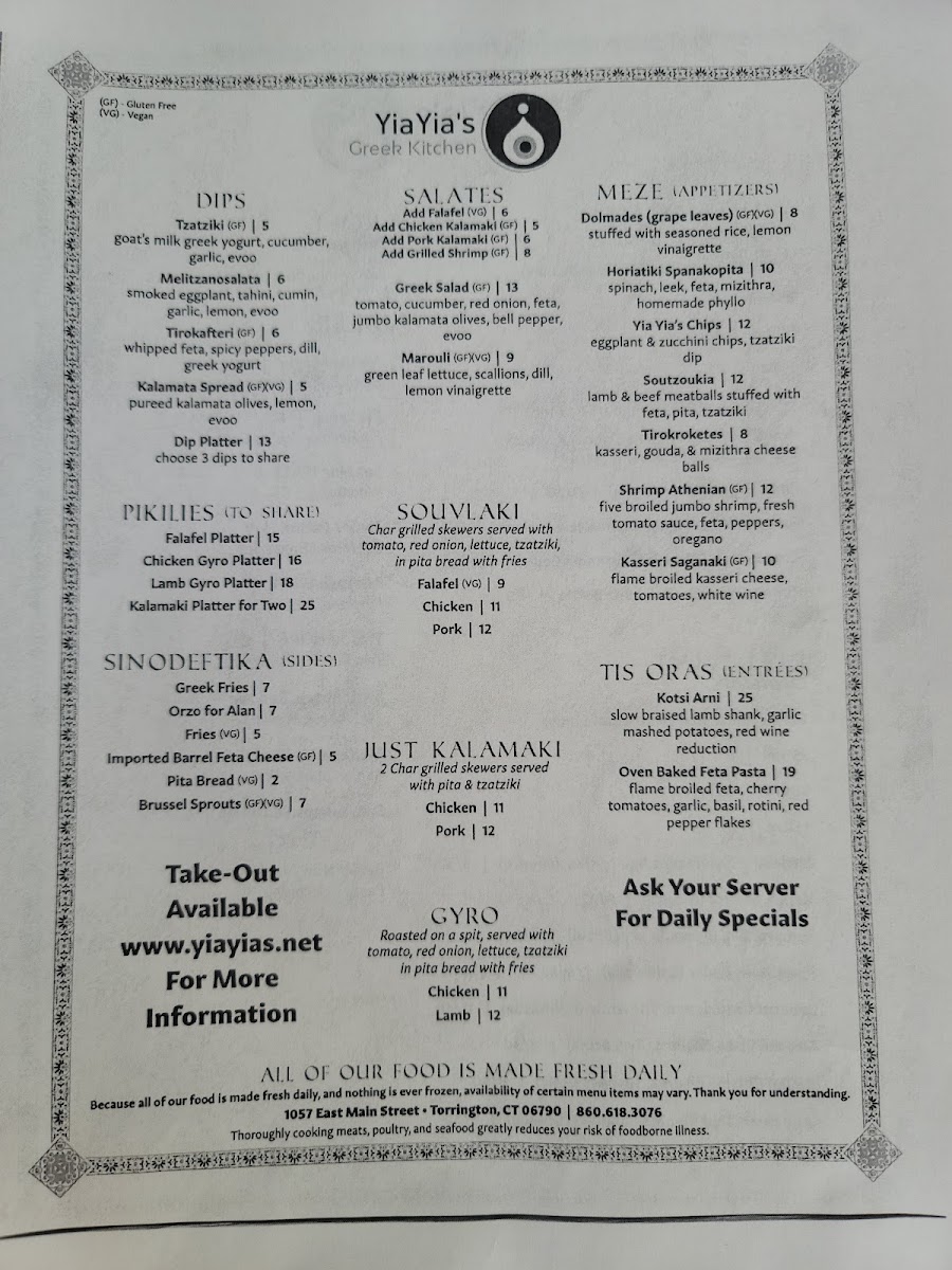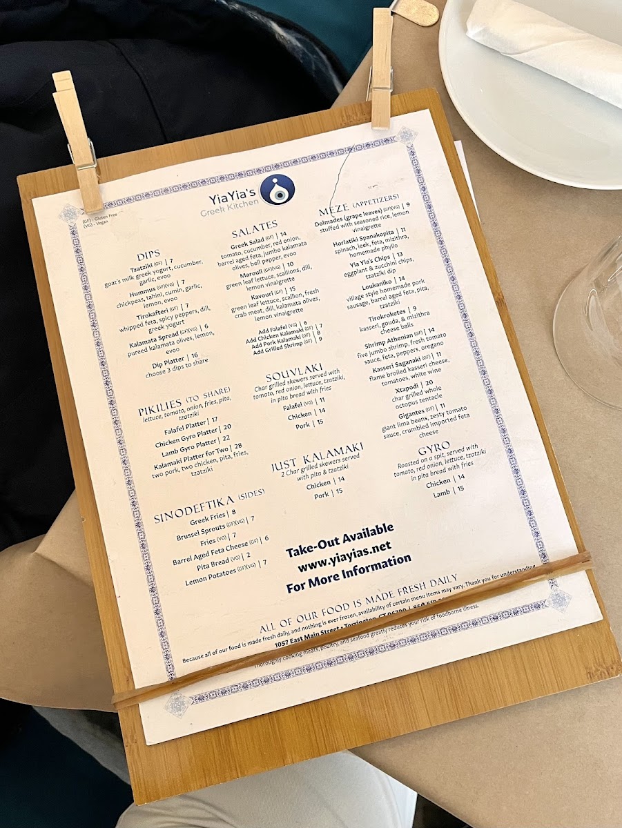 From a reviewer’s perspective, the menu at Yiayia's Greek Kitchen offers a well-rounded and satisfying snapshot of traditional Greek comfort food, thoughtfully curated to suit both sharing and individual dining. The experience often begins with Meze and Appetizers such as Yia Yia's Chips, Dolmades (Grape Leaves), Shrimp Athenian, Gigantes, and Falafel, which set a welcoming tone with familiar Mediterranean flavors. Moving into the heart of the menu, the Gyro selection-Lamb Gyro and Chicken Gyro-delivers the classic, hearty appeal diners expect, while the “Just Kalamaki” options like Chicken Kalamaki and Pork Kalamaki highlight simple, well-seasoned grilled skewers. The Souvlaki choices, including Falafel Souvlaki, Pork Souvlaki, and Chicken Souvlaki, further reinforce the restaurant’s strength in balancing meat and vegetarian offerings. Complementing these mains are flavorful dips such as Kalamata Spread, Hummus, Tirokafteri, Tzatziki, and the Dip Platter, ideal for sharing with warm pita. Side dishes under Sinodeftika-Brussel Sprouts, Greek Fries, Barrel Aged Feta Cheese, Pita Bread, and Lemon Potatoes-round out the meal with variety and texture. For groups, Pikilies like the Kalamaki Platter For Two, Lamb Gyro Platter, Falafel Platter, and Chicken Gyro Platter make communal dining easy and enjoyable. Freshness comes through in salads such as Kavouri, Greek Salad, and Marouli, while desserts like Kataifi and Traditional Baklava provide a sweet, authentic finish. Overall, the menu feels cohesive and comforting, successfully summarizing Yiayia’s Greek Kitchen’s commitment to classic Greek flavors presented in a way that’s approachable, shareable, and deeply satisfying.