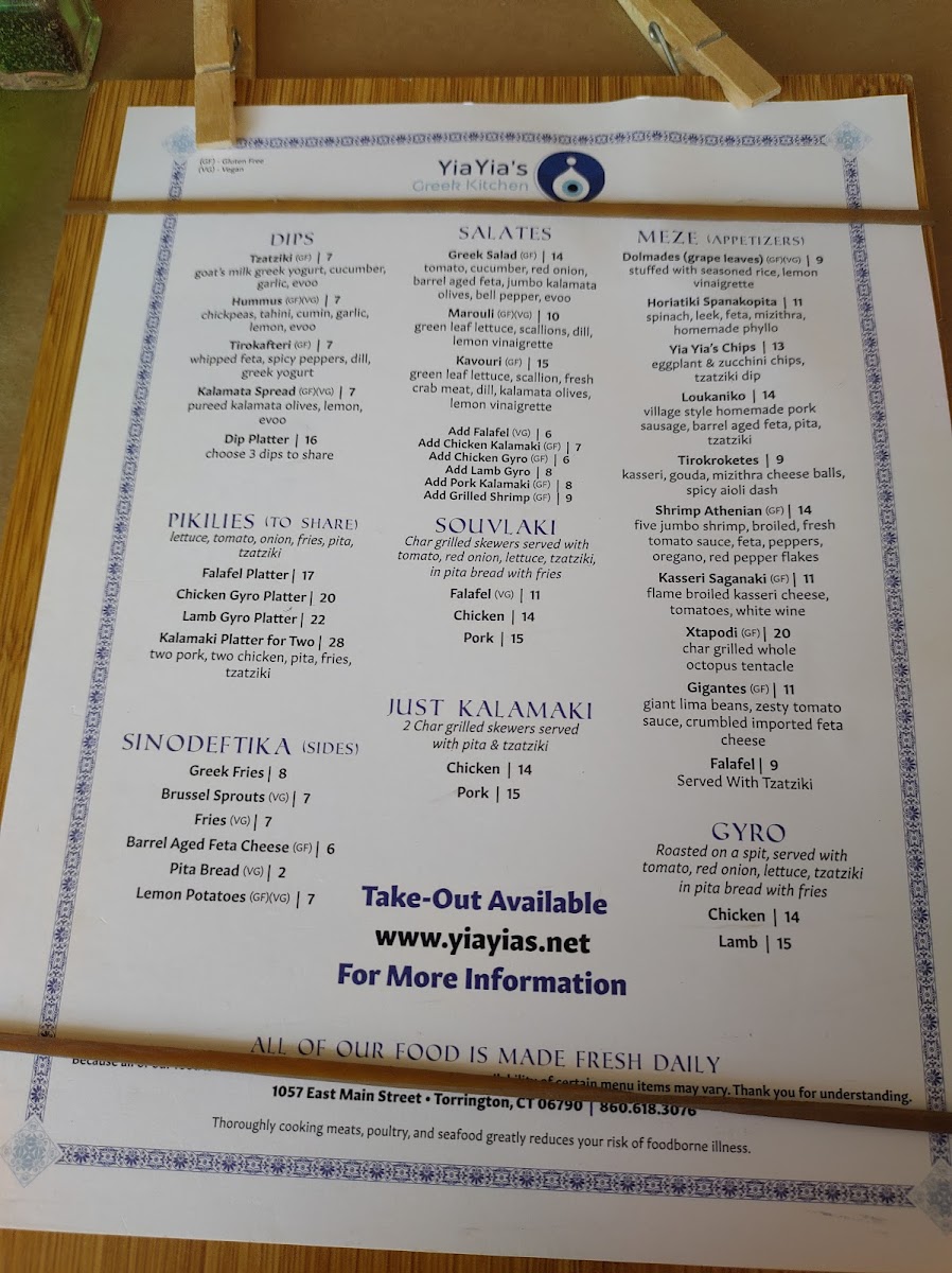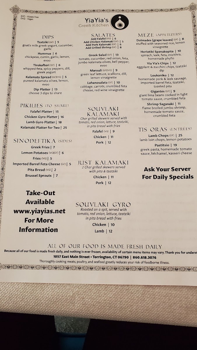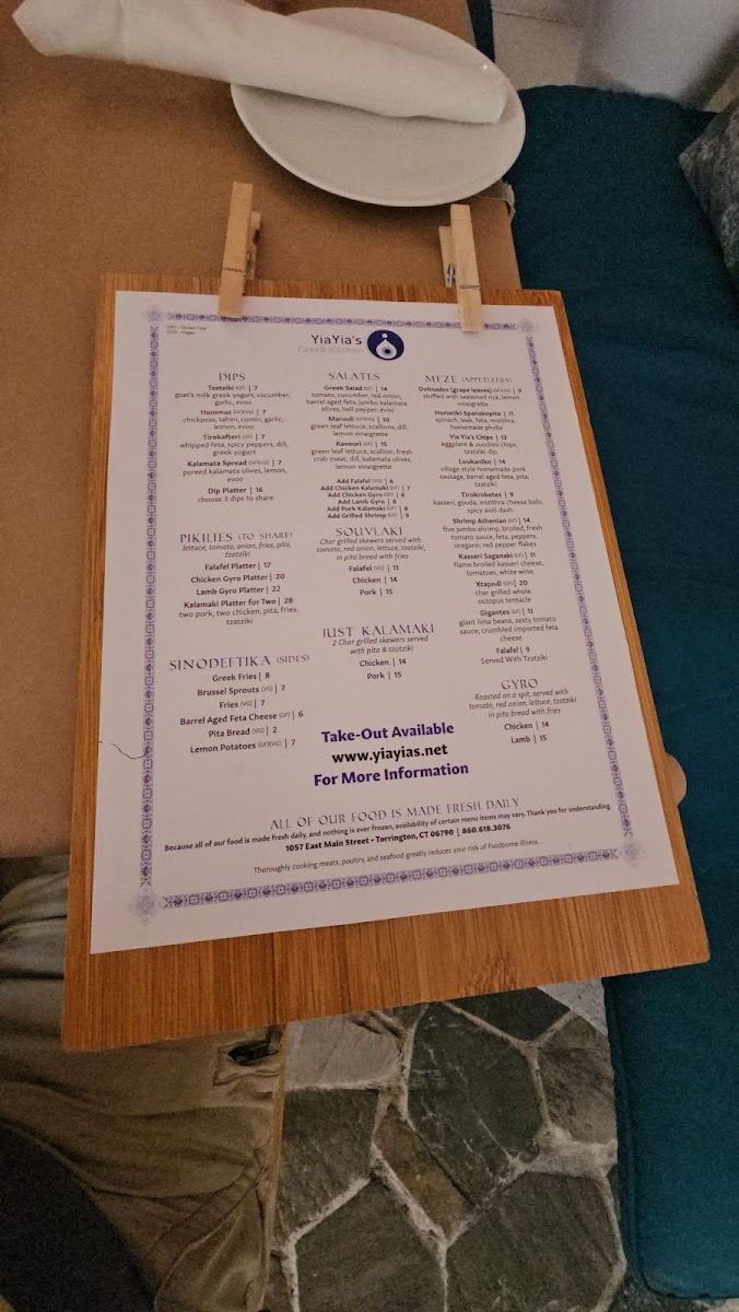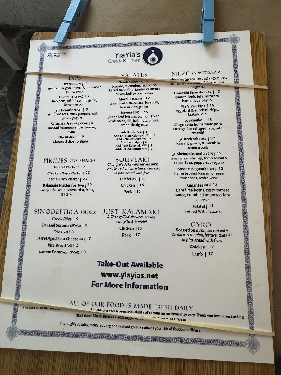 From a reviewer’s perspective, the menu at Yiayia's Greek Kitchen offers a well-rounded and satisfying snapshot of traditional Greek comfort food, thoughtfully curated to suit both sharing and individual dining. The experience often begins with Meze and Appetizers such as Yia Yia's Chips, Dolmades (Grape Leaves), Shrimp Athenian, Gigantes, and Falafel, which set a welcoming tone with familiar Mediterranean flavors. Moving into the heart of the menu, the Gyro selection-Lamb Gyro and Chicken Gyro-delivers the classic, hearty appeal diners expect, while the “Just Kalamaki” options like Chicken Kalamaki and Pork Kalamaki highlight simple, well-seasoned grilled skewers. The Souvlaki choices, including Falafel Souvlaki, Pork Souvlaki, and Chicken Souvlaki, further reinforce the restaurant’s strength in balancing meat and vegetarian offerings. Complementing these mains are flavorful dips such as Kalamata Spread, Hummus, Tirokafteri, Tzatziki, and the Dip Platter, ideal for sharing with warm pita. Side dishes under Sinodeftika-Brussel Sprouts, Greek Fries, Barrel Aged Feta Cheese, Pita Bread, and Lemon Potatoes-round out the meal with variety and texture. For groups, Pikilies like the Kalamaki Platter For Two, Lamb Gyro Platter, Falafel Platter, and Chicken Gyro Platter make communal dining easy and enjoyable. Freshness comes through in salads such as Kavouri, Greek Salad, and Marouli, while desserts like Kataifi and Traditional Baklava provide a sweet, authentic finish. Overall, the menu feels cohesive and comforting, successfully summarizing Yiayia’s Greek Kitchen’s commitment to classic Greek flavors presented in a way that’s approachable, shareable, and deeply satisfying.